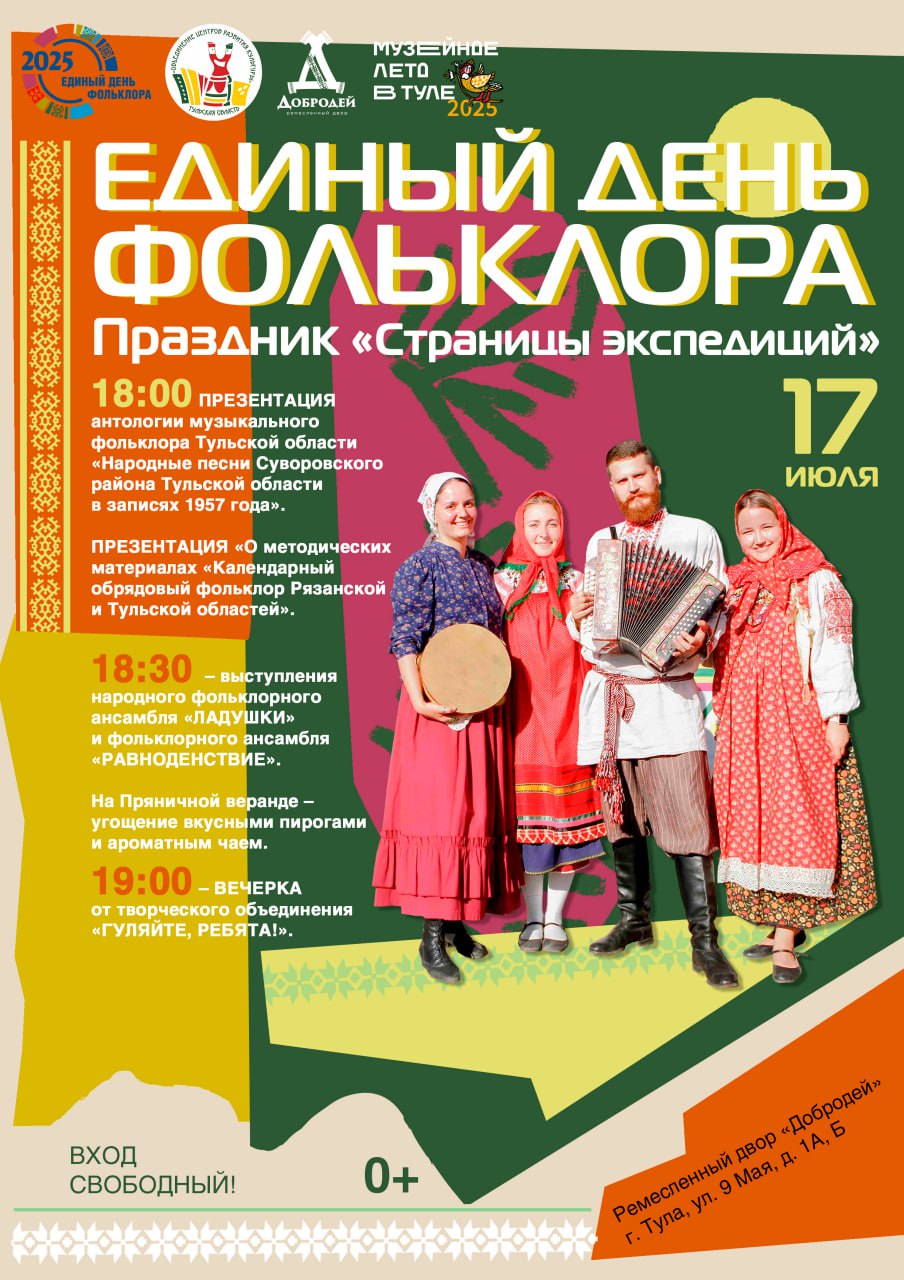 17 июля в рамках Всероссийской акции «Единый день фольклора» в ремесленном дворе «Добродей» пройдет праздник «Страницы экспедиций». Мероприятие состоится в рамках культурно-просветительского проекта «Музейное лето в Туле».