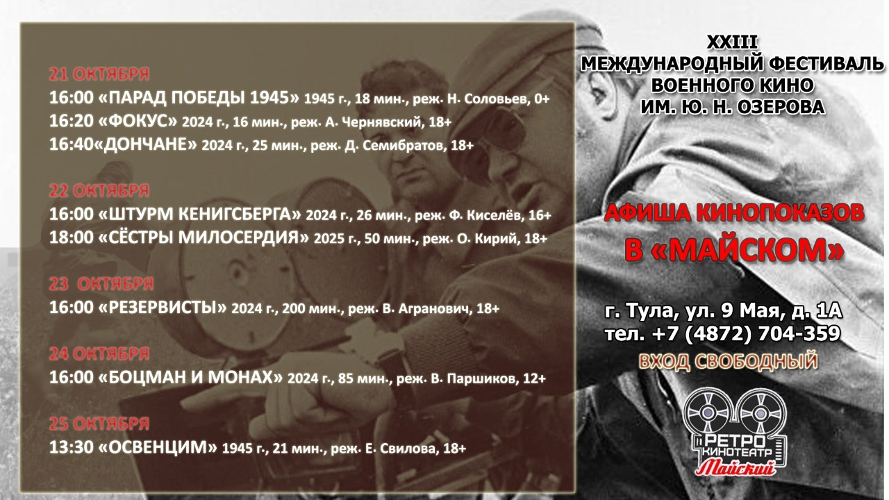 С 21 по 25 октября в ретрокинотеатре «Майский» состоятся показы фильмов из программы ХХIII Международного фестиваля военного кино имени Ю. Н. Озерова, посвященного 80-летию Великой Победы и 84-й годовщине героической обороны Тулы от немецко-фашистских захватчиков в 1941 году.