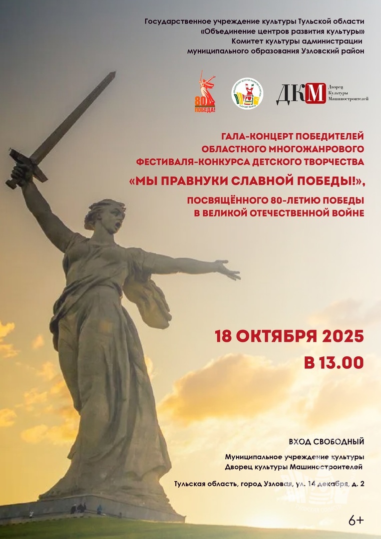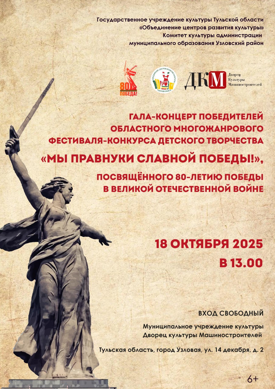 18 октября в Узловой во Дворце культуры Машиностроителей состоится гала-концерт победителей и награждение дипломантов фестиваля-конкурса детского творчества «Мы правнуки славной Победы!», посвящённого 80-летию Победы в Великой Отечественной войне.