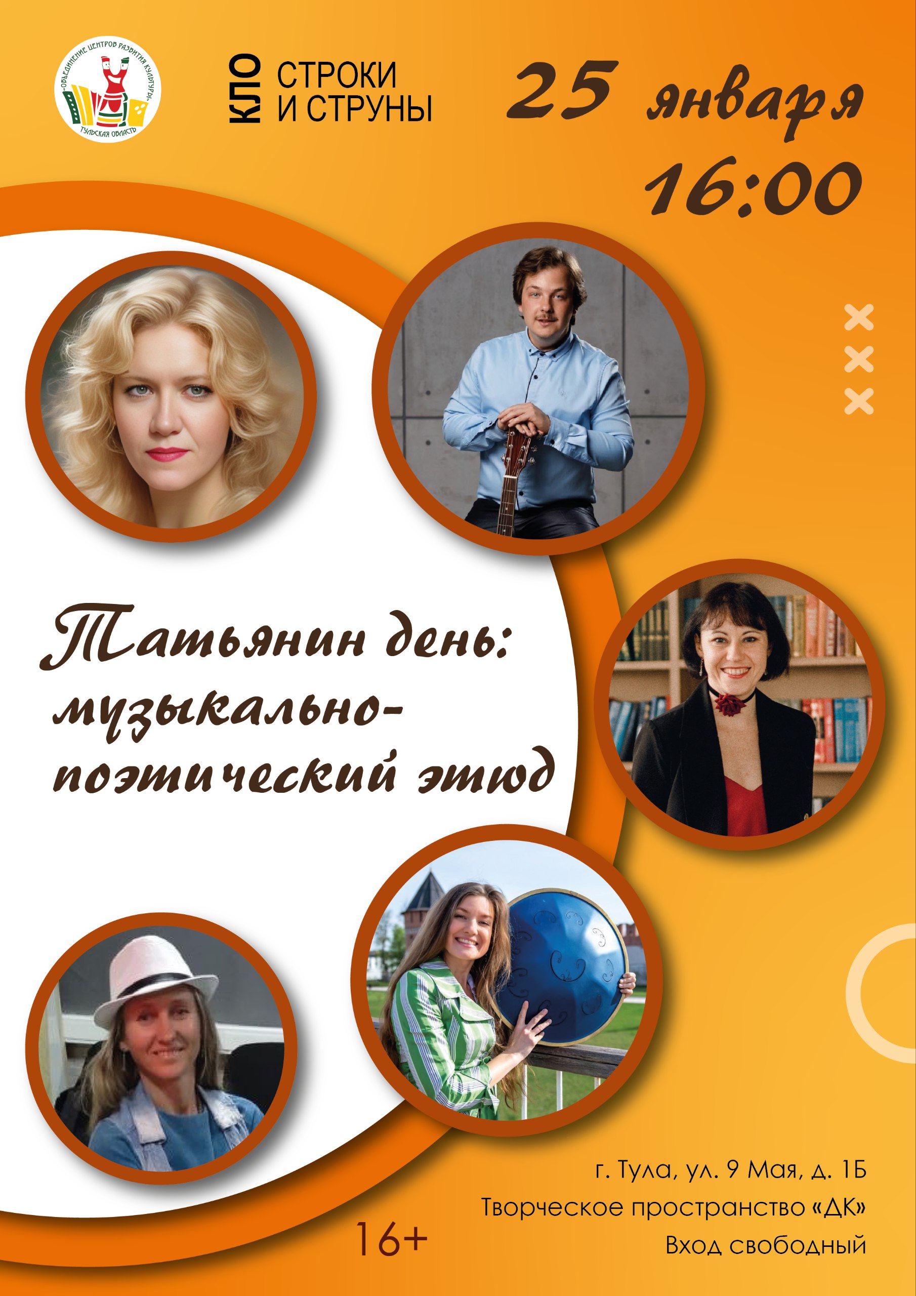 25 января в творческом пространстве «ДК» Объединения центров развития культуры клубное любительское объединение «Строки и струны» проводит вечер «Татьянин день: музыкально-поэтический этюд».