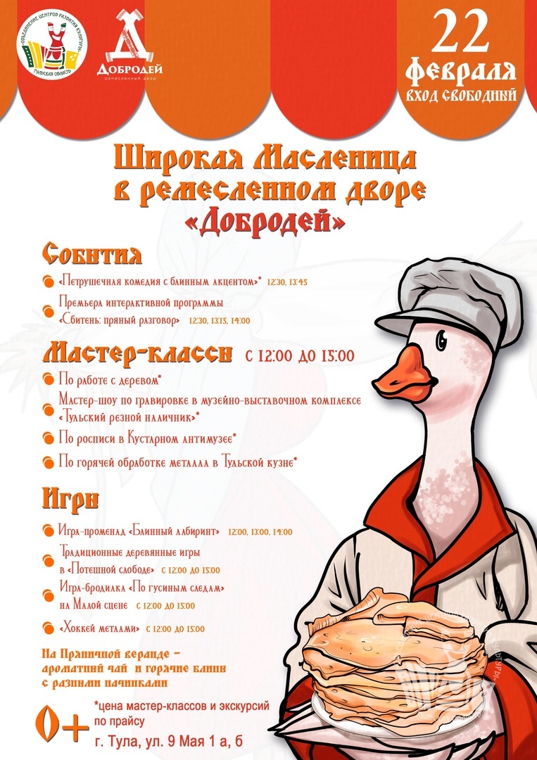 22 февраля в ремесленном дворе «Добродей» состоится праздник Широкая Масленица, который погрузит гостей в атмосферу народного гулянья.