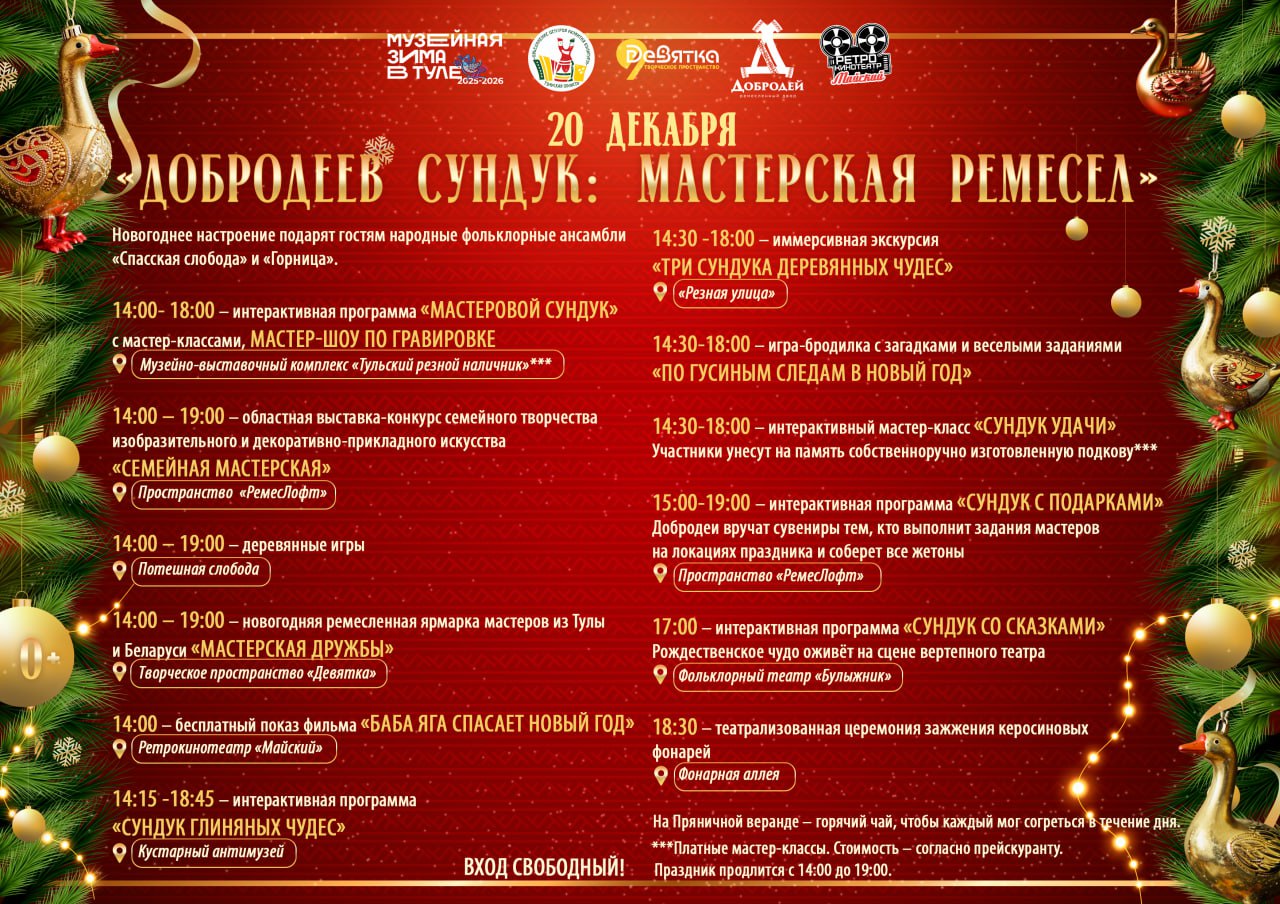 20 декабря с 14:00 до 19:00 в ремесленном дворе состоится праздник «Добродеев сундук: мастерская ремесел». Событие вошло в программу регионального проекта «Музейная зима в Туле».