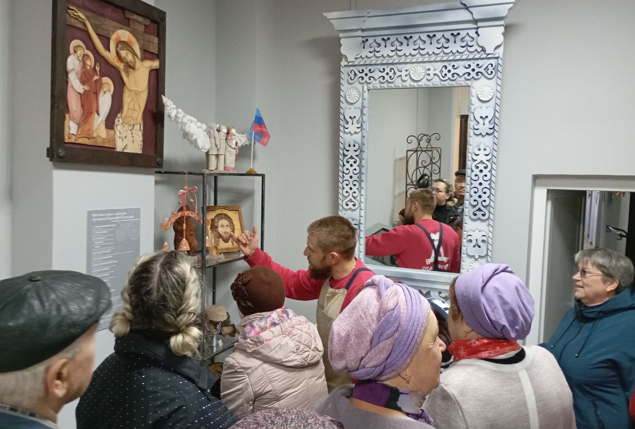 Гости осмотрели экспозицию, которая размещена в творческом пространстве «В ажуре» и насчитывает порядка 20 экспонатов. Они полюбовались резьбой и росписью по дереву, художественной обработкой металла, текстильными куклами, керамикой и другими замечательными изделиями. Среди них – икона Спас Нерукотворный, выполненная в различных техниках художественной резьбы по дереву заслуженным мастером народного творчества ЛНР Юрием Тихим. Иконы его искусной работы находятся в храмах Луганщины, музеях Франции, Польши, Германии.